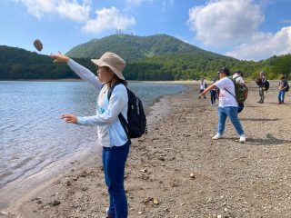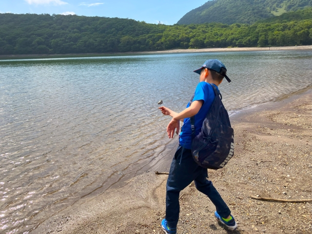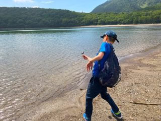 山を降りると小沼が待っています。時間の許す限り水切りや石投げで遊びました。