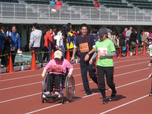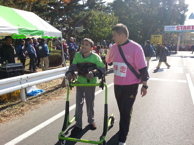 1年前入院中の骨折で車いす生活となりました。医者からは歩くことは難しいと宣告されましたが、半年前より生活介護班日中活動で歩行器(ゲートトレーナー)での歩行練習を行い県民マラソンに出場。目標の2㎞を大幅に越えて笑顔で4㎞を完歩しました。