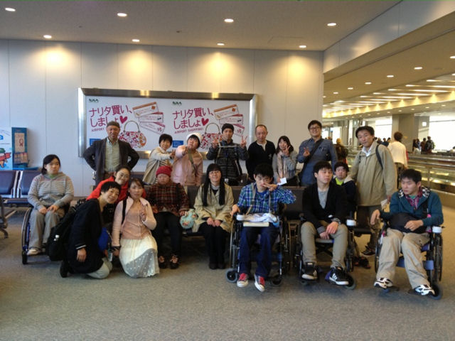 すてっぷ海外旅行歴4回の利用者さん(ハワイ、グアム、ケアンズ、グアム)から初めての利用者さんまで元気に出発しました。(わーく、ぴいす、とらっぱ合計12名の利用者さんとスタッフ7名、合計19名)