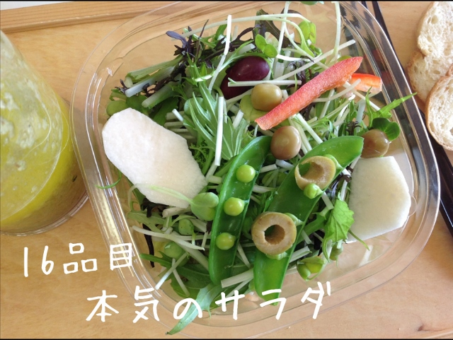 季節によって変わる数種類のグリーン野菜に、豆やオリーブなど16品目入ったサラダ。