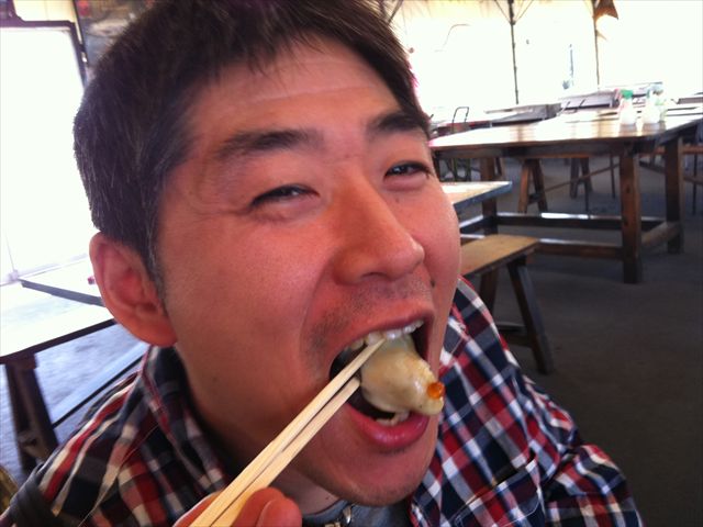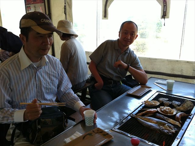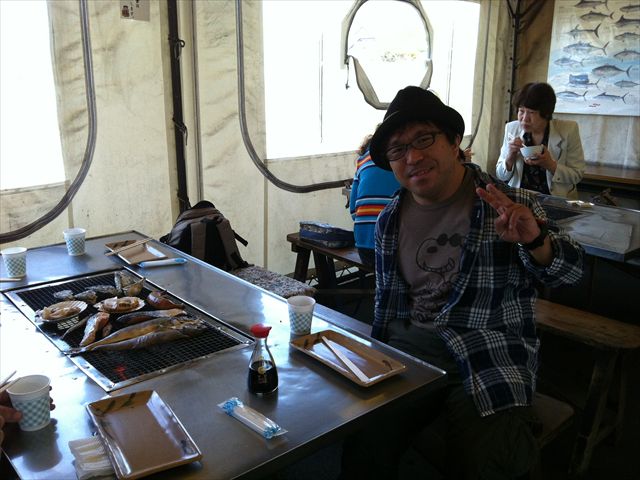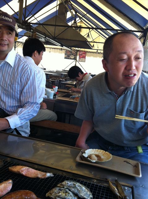 煙に巻かれながら新鮮な魚介類を焼きました。バスの中で煙の臭いを気にしてる人も。